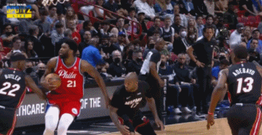 由于本场比赛哈登没有出战,恩比德也不得不独自面对热火的死亡缠绕的防守方式。在边线附近,恩比德拿球之后,他被三人包夹。